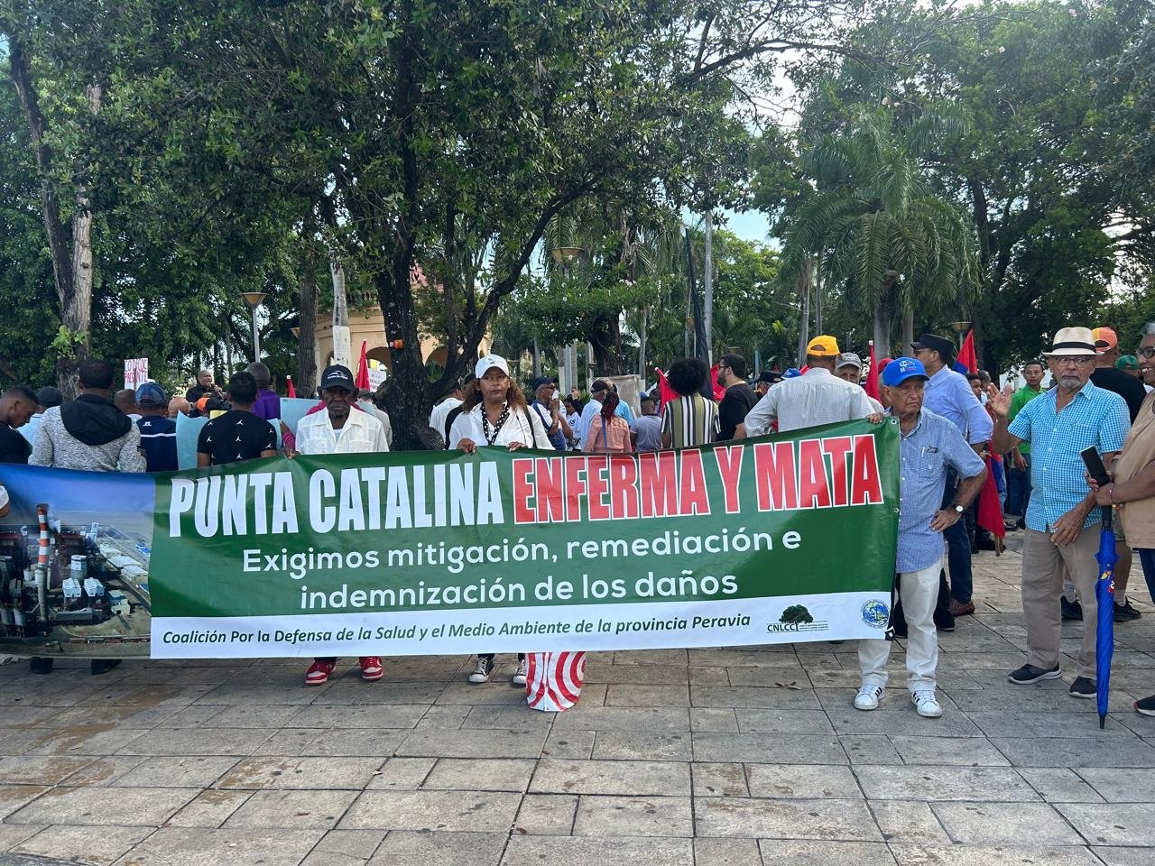 Detrás de la banderola Punta Catalina enferma y mata, dirigentes y militantes de diferentes comunidades de la provincia Peravia, así como del Comité Nacional de Lucha Contra el Cambio Climático, CNLCC, el Instituto de Abogados para la Protección del Medio Ambiente, INSAPROMA, y de la Asociación Dominicana de Profesores, ADP marcharon hasta llegar al Palacio Nacional.